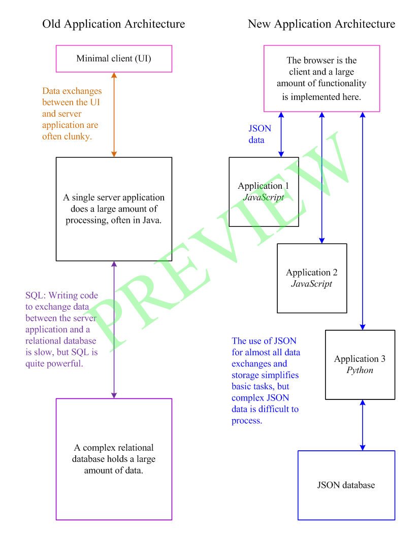 Those of us who had some computer science classes typically treated the client (UI) as a minor part of an application. Most of the complexity and functionality existed in the server application and the database. The database was usually a relational database using SQL. Now, most applications have complex client code running in browsers. The server application may be divided up into several separate programs. The database stores JSON data.